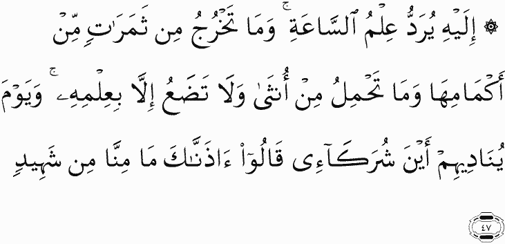 To him [alone] is attributed knowledge of the Hour. And fruits emerge not from their coverings nor does a female conceive or give birth except with His knowledge. And the Day He will call to them, "Where are My 'partners'?" they will say, "We announce to You that there is [no longer] among us any witness [to that]."