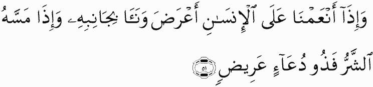 And when We bestow favor upon man, he turns away and distances himself; but when evil touches him, then he is full of extensive supplication.