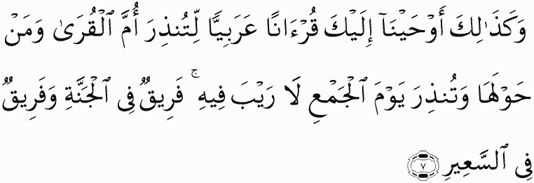 And thus We have revealed to you an Arabic Qur'an that you may warn the Mother of Cities [Makkah] and those around it and warn of the Day of Assembly, about which there is no doubt. A party will be in Paradise and a party in the Blaze.