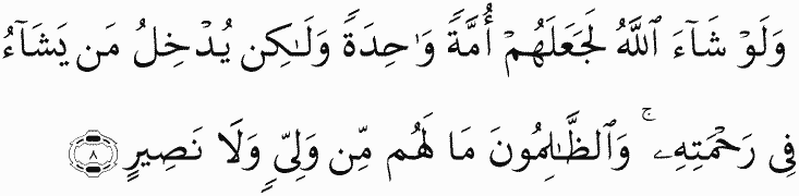 And if Allah willed, He could have made them [of] one religion, but He admits whom He wills into His mercy. And the wrongdoers have not any protector or helper.