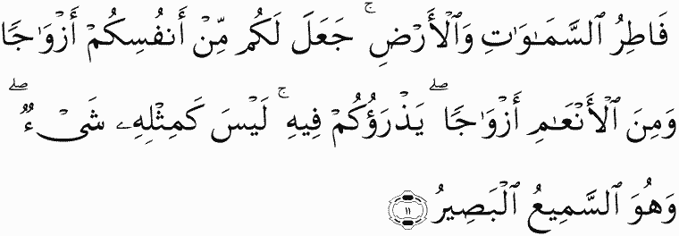 [He is] Creator of the heavens and the earth. He has made for you from yourselves, mates, and among the cattle, mates; He multiplies you thereby. There is nothing like unto Him, and He is the Hearing, the Seeing.