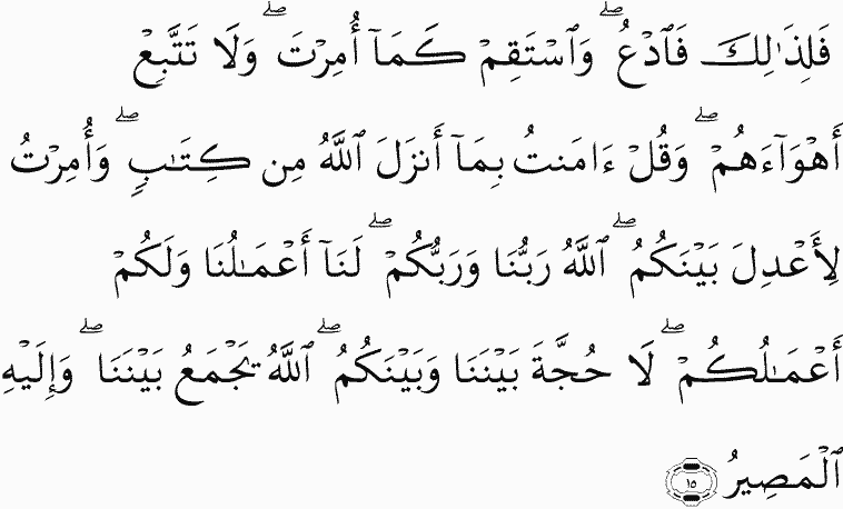 So to that [religion of Allah ] invite, [O Muhammad], and remain on a right course as you are commanded and do not follow their inclinations but say, "I have believed in what Allah has revealed of the Qur'an, and I have been commanded to do justice among you. Allah is our Lord and your Lord. For us are our deeds, and for you your deeds. There is no [need for] argument between us and you. Allah will bring us together, and to Him is the [final] destination."