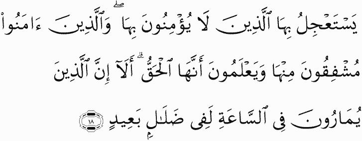 Those who do not believe in it are impatient for it, but those who believe are fearful of it and know that it is the truth. Unquestionably, those who dispute concerning the Hour are in extreme error.