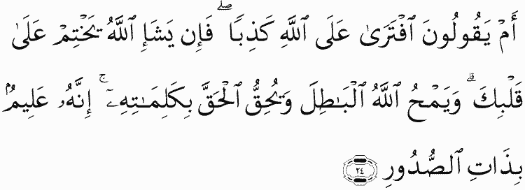 Or do they say, "He has invented about Allah a lie"? But if Allah willed, He could seal over your heart. And Allah eliminates falsehood and establishes the truth by His words. Indeed, He is Knowing of that within the breasts.