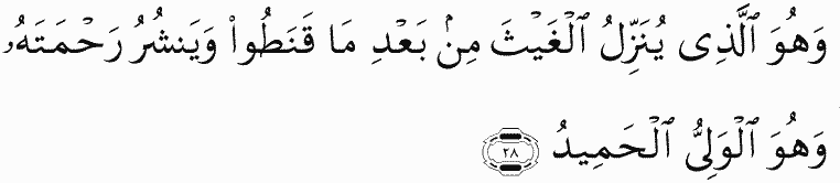 And it is He who sends down the rain after they had despaired and spreads His mercy. And He is the Protector, the Praiseworthy.