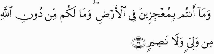 And you will not cause failure [to Allah ] upon the earth. And you have not besides Allah any protector or helper.