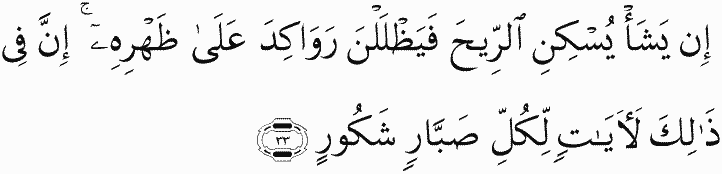 If He willed, He could still the wind, and they would remain motionless on its surface. Indeed in that are signs for everyone patient and grateful.