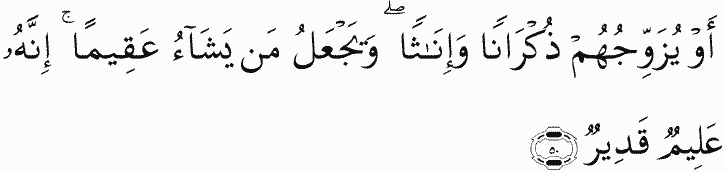 Or He makes them [both] males and females, and He renders whom He wills barren. Indeed, He is Knowing and Competent.