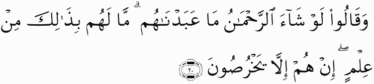 And they said, "If the Most Merciful had willed, we would not have worshipped them." They have of that no knowledge. They are not but falsifying.