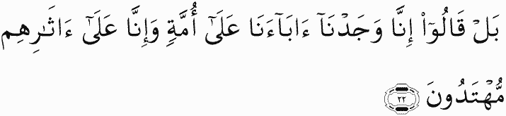 Rather, they say, "Indeed, we found our fathers upon a religion, and we are in their footsteps [rightly] guided."