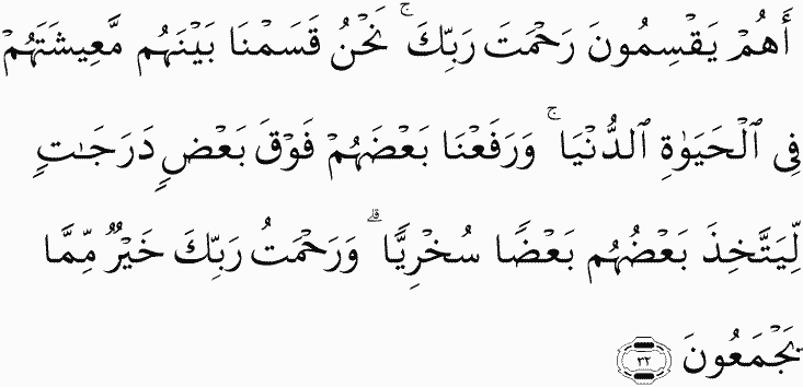 Do they distribute the mercy of your Lord? It is We who have apportioned among them their livelihood in the life of this world and have raised some of them above others in degrees [of rank] that they may make use of one another for service. But the mercy of your Lord is better than whatever they accumulate.