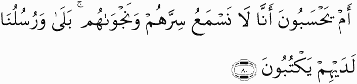 Or do they think that We hear not their secrets and their private conversations? Yes, [We do], and Our messengers are with them recording.