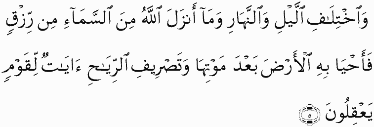 And [in] the alternation of night and day and [in] what Allah sends down from the sky of provision and gives life thereby to the earth after its lifelessness and [in His] directing of the winds are signs for a people who reason.