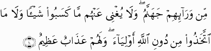 Before them is Hell, and what they had earned will not avail them at all nor what they had taken besides Allah as allies. And they will have a great punishment.