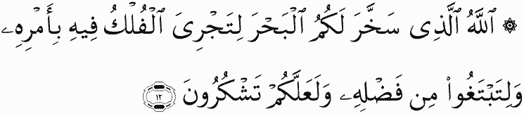 It is Allah who subjected to you the sea so that ships may sail upon it by His command and that you may seek of His bounty; and perhaps you will be grateful.