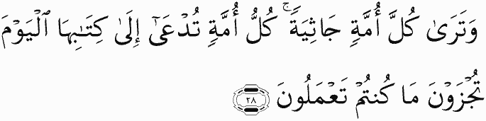 And you will see every nation kneeling [from fear]. Every nation will be called to its record [and told], "Today you will be recompensed for what you used to do.