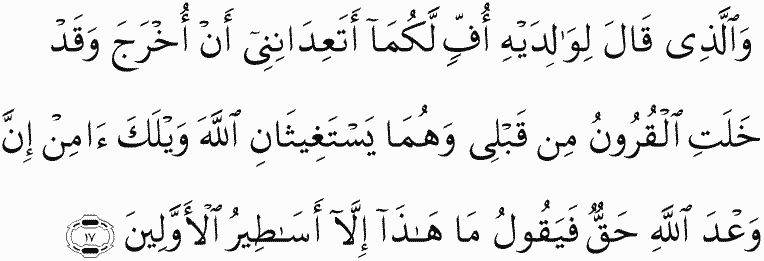 But one who says to his parents, "Uff to you; do you promise me that I will be brought forth [from the earth] when generations before me have already passed on [into oblivion]?" while they call to Allah for help [and to their son], "Woe to you! Believe! Indeed, the promise of Allah is truth." But he says, "This is not but legends of the former people" -