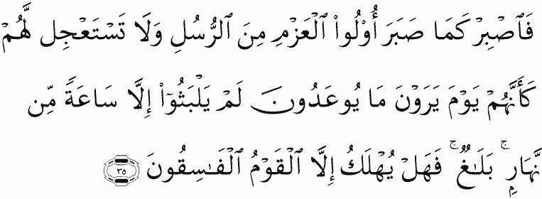 So be patient, [O Muhammad], as were those of determination among the messengers and do not be impatient for them. It will be - on the Day they see that which they are promised - as though they had not remained [in the world] except an hour of a day. [This is] notification. And will [any] be destroyed except the defiantly disobedient people?