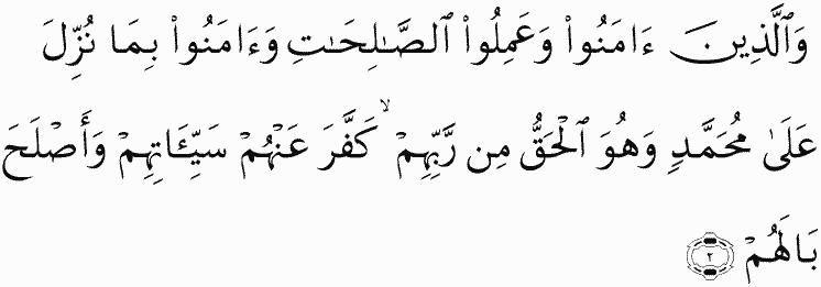 And those who believe and do righteous deeds and believe in what has been sent down upon Muhammad - and it is the truth from their Lord - He will remove from them their misdeeds and amend their condition.