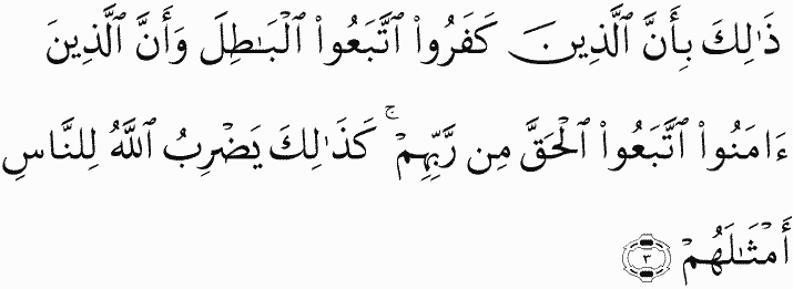 That is because those who disbelieve follow falsehood, and those who believe follow the truth from their Lord. Thus does Allah present to the people their comparisons.