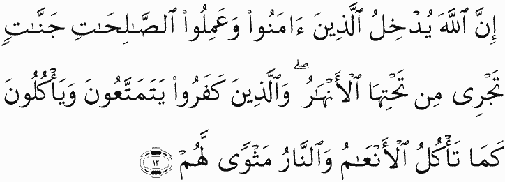 Indeed, Allah will admit those who have believed and done righteous deeds to gardens beneath which rivers flow, but those who disbelieve enjoy themselves and eat as grazing livestock eat, and the Fire will be a residence for them.