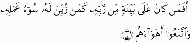 So is he who is on clear evidence from his Lord like him to whom the evil of his work has been made attractive and they follow their [own] desires?