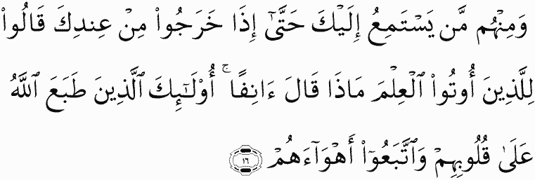 And among them, [O Muhammad], are those who listen to you, until when they depart from you, they say to those who were given knowledge, "What has he said just now?" Those are the ones of whom Allah has sealed over their hearts and who have followed their [own] desires.