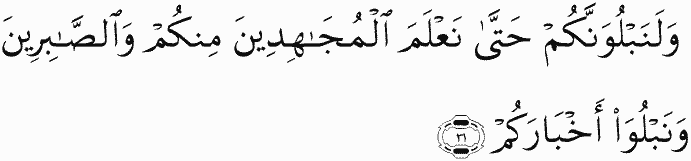 And We will surely test you until We make evident those who strive among you [for the cause of Allah ] and the patient, and We will test your affairs.