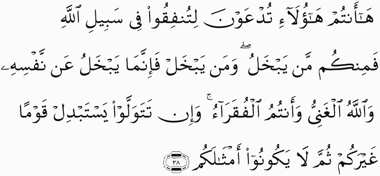Here you are - those invited to spend in the cause of Allah - but among you are those who withhold [out of greed]. And whoever withholds only withholds [benefit] from himself; and Allah is the Free of need, while you are the needy. And if you turn away, He will replace you with another people; then they will not be the likes of you.