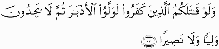 And if those [Makkans] who disbelieve had fought you, they would have turned their backs [in flight]. Then they would not find a protector or a helper.
