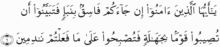 O you who have believed, if there comes to you a disobedient one with information, investigate, lest you harm a people out of ignorance and become, over what you have done, regretful.