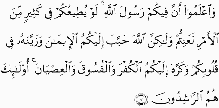 And know that among you is the Messenger of Allah . If he were to obey you in much of the matter, you would be in difficulty, but Allah has endeared to you the faith and has made it pleasing in your hearts and has made hateful to you disbelief, defiance and disobedience. Those are the [rightly] guided.