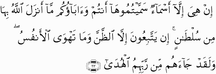 They are not but [mere] names you have named them - you and your forefathers - for which Allah has sent down no authority. They follow not except assumption and what [their] souls desire, and there has already come to them from their Lord guidance.