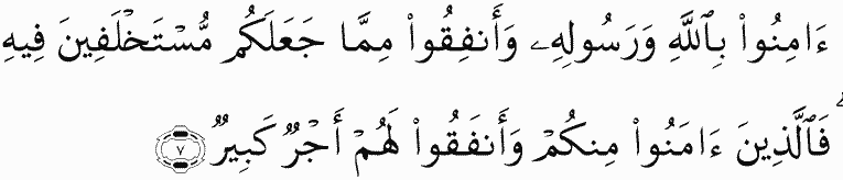 Believe in Allah and His Messenger and spend out of that in which He has made you successors. For those who have believed among you and spent, there will be a great reward.