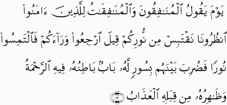 On the [same] Day the hypocrite men and hypocrite women will say to those who believed, "Wait for us that we may acquire some of your light." It will be said, "Go back behind you and seek light." And a wall will be placed between them with a door, its interior containing mercy, but on the outside of it is torment.