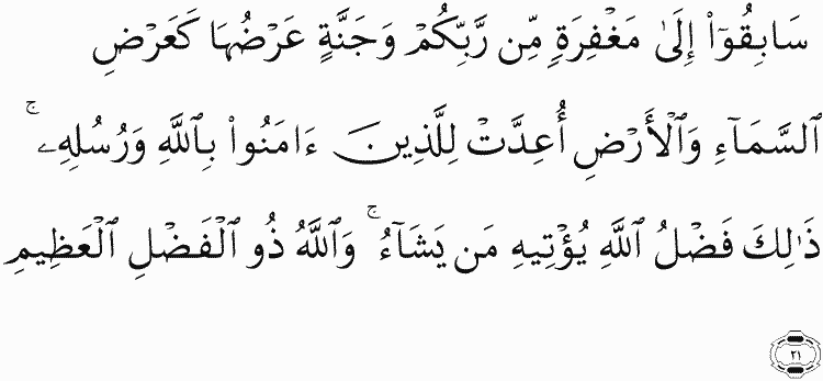 Race toward forgiveness from your Lord and a Garden whose width is like the width of the heavens and earth, prepared for those who believed in Allah and His messengers. That is the bounty of Allah which He gives to whom He wills, and Allah is the possessor of great bounty.