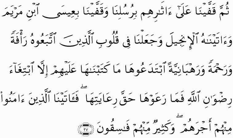 Then We sent following their footsteps Our messengers and followed [them] with Jesus, the son of Mary, and gave him the Gospel. And We placed in the hearts of those who followed him compassion and mercy and monasticism, which they innovated; We did not prescribe it for them except [that they did so] seeking the approval of Allah . But they did not observe it with due observance. So We gave the ones who believed among them their reward, but many of them are defiantly disobedient.