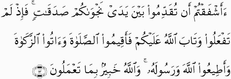Have you feared to present before your consultation charities? Then when you do not and Allah has forgiven you, then [at least] establish prayer and give zakah and obey Allah and His Messenger. And Allah is Acquainted with what you do.