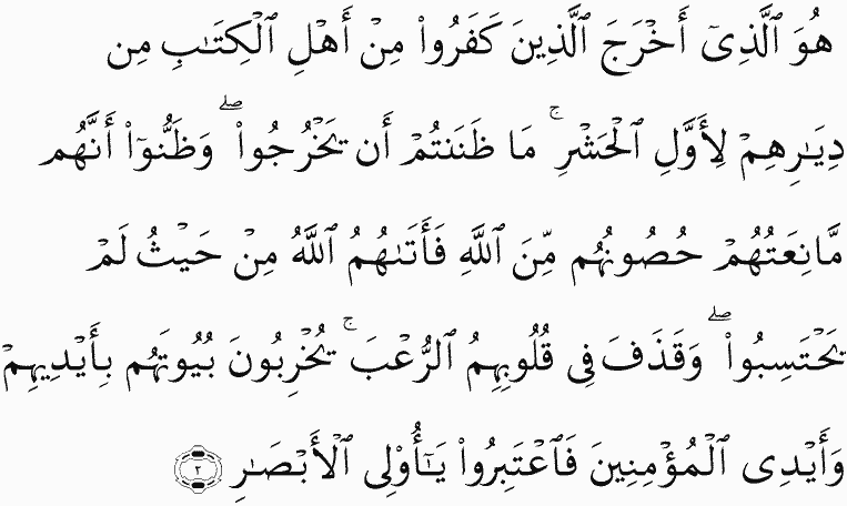 It is He who expelled the ones who disbelieved among the People of the Scripture from their homes at the first gathering. You did not think they would leave, and they thought that their fortresses would protect them from Allah ; but [the decree of] Allah came upon them from where they had not expected, and He cast terror into their hearts [so] they destroyed their houses by their [own] hands and the hands of the believers. So take warning, O people of vision.