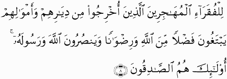 For the poor emigrants who were expelled from their homes and their properties, seeking bounty from Allah and [His] approval and supporting Allah and His Messenger, [there is also a share]. Those are the truthful.