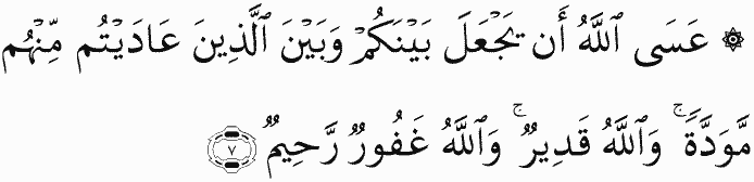 Perhaps Allah will put, between you and those to whom you have been enemies among them, affection. And Allah is competent, and Allah is Forgiving and Merciful.