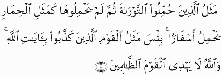 The example of those who were entrusted with the Torah and then did not take it on is like that of a donkey who carries volumes [of books]. Wretched is the example of the people who deny the signs of Allah . And Allah does not guide the wrongdoing people.