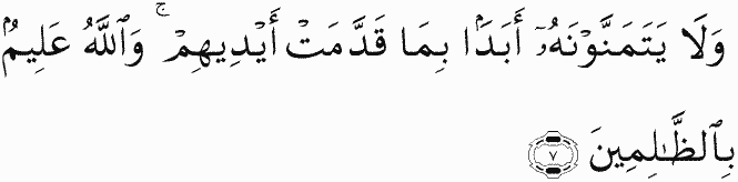 But they will not wish for it, ever, because of what their hands have put forth. And Allah is Knowing of the wrongdoers.