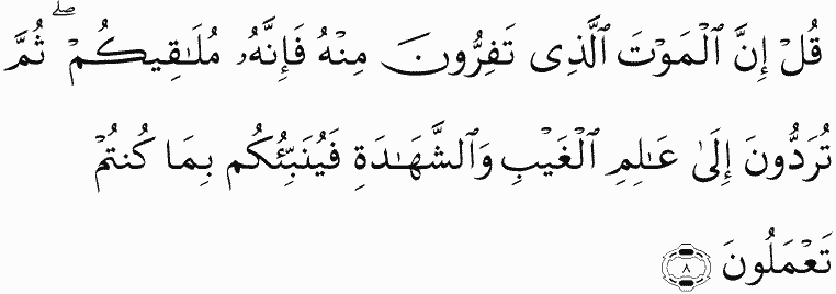 Say, "Indeed, the death from which you flee - indeed, it will meet you. Then you will be returned to the Knower of the unseen and the witnessed, and He will inform you about what you used to do."