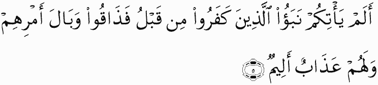 Has there not come to you the news of those who disbelieved before? So they tasted the bad consequence of their affair, and they will have a painful punishment.