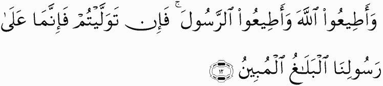 And obey Allah and obey the Messenger; but if you turn away - then upon Our Messenger is only [the duty of] clear notification.