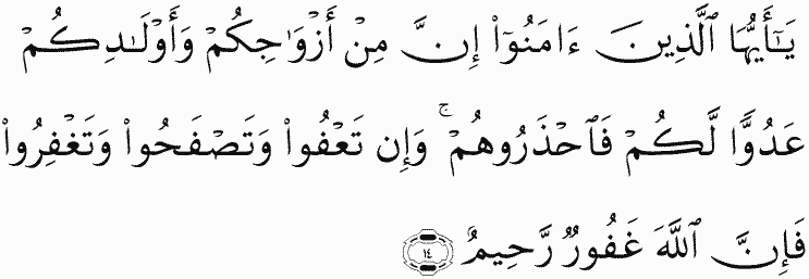 O you who have believed, indeed, among your wives and your children are enemies to you, so beware of them. But if you pardon and overlook and forgive - then indeed, Allah is Forgiving and Merciful.