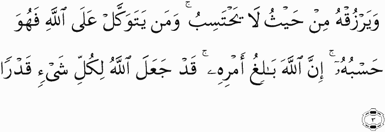 And will provide for him from where he does not expect. And whoever relies upon Allah - then He is sufficient for him. Indeed, Allah will accomplish His purpose. Allah has already set for everything a [decreed] extent.