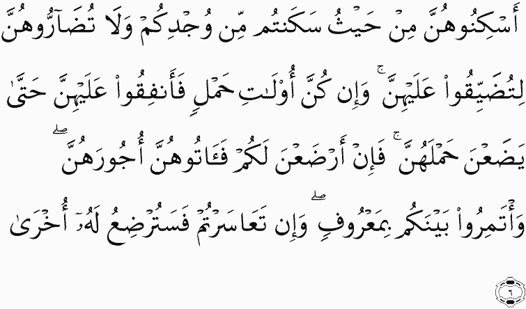 Lodge them [in a section] of where you dwell out of your means and do not harm them in order to oppress them. And if they should be pregnant, then spend on them until they give birth. And if they breastfeed for you, then give them their payment and confer among yourselves in the acceptable way; but if you are in discord, then there may breastfeed for the father another woman.