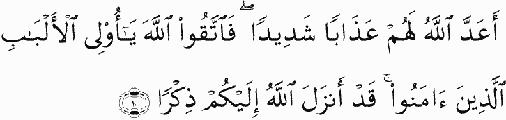 Allah has prepared for them a severe punishment; so fear Allah , O you of understanding who have believed. Allah has sent down to you the Qur'an.